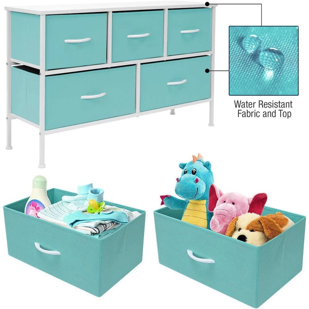 Update your child’s room with the Sorbus 5-drawer Dresser. This colorful dresser chest features a tabletop surface and pull-out-drawers to tuck away household clutter. Place all of your child’s folded t-shirts, jeans, and pajamas, or extra blankets and toys within the spacious fabric drawers. for display, the top surface can be used for lamps, books, clocks, and more. The playful aqua color makes this furniture storage charming for any nursery, playroom, or bedroom. It is lightweight for easy transport and when not in use, simply fold the fabric-drawers flat for storage. Complete the look with any unit from our Furniture Collection.
