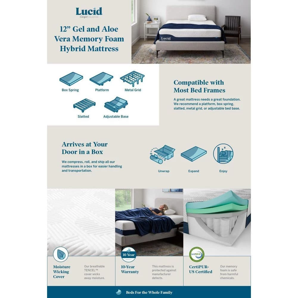 Crafted with attention to detail, the Lucid Comfort Collection 12″ Gel and Aloe Vera Queen Hybird Mattress features five layers of premium materials designed for your comfort. It all starts with a top layer of gel memory foam that contours to your body’s curves while helping to dissipate heat. Next, aloe vera is infused in the mattress to promote freshness. The mattress foundation is set on individually encased coils embraced by two layers of base foam. Truly a premium hybrid mattress, you’ll love its supportive comfort and hypoallergenic design.