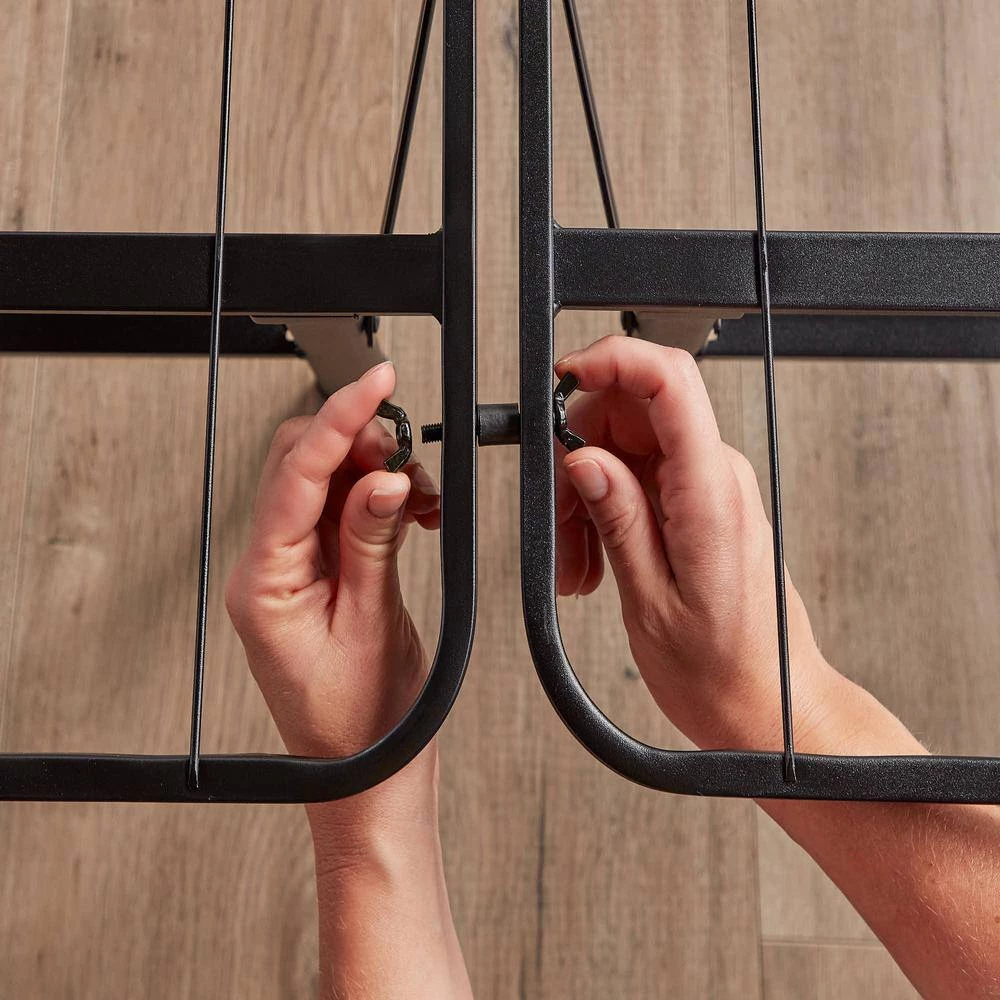 - Easy assembly: metal bed frame assembly takes five minutes and only includes unfolding the frame and snapping into place, full, queen, king and cal king sizes require just one extra step of tightening the bolts to secure the two pieces together