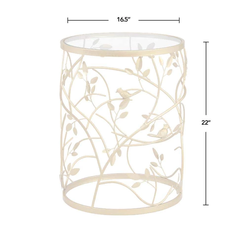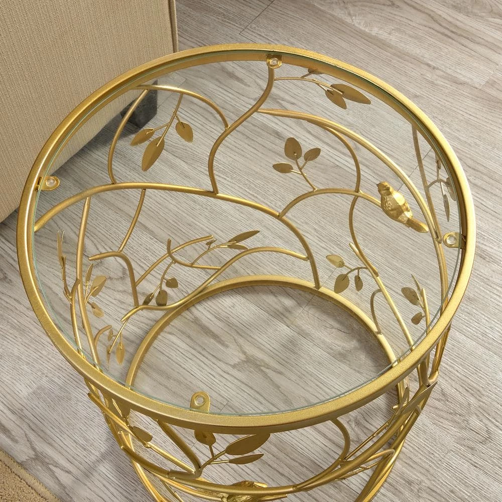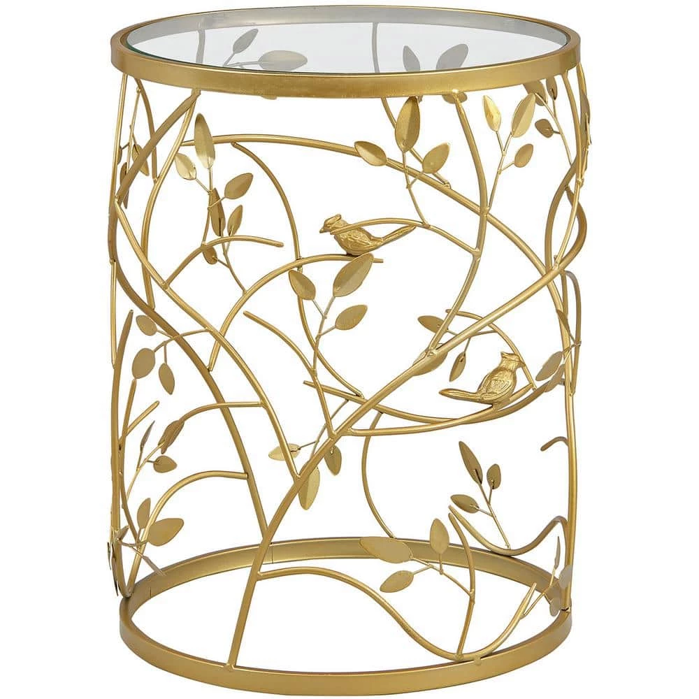 - It’s in the details – this accent table is crafted of iron with an antique gold finish, complete with a carved bird and branches pattern to give it a rustic, yet modern appeal