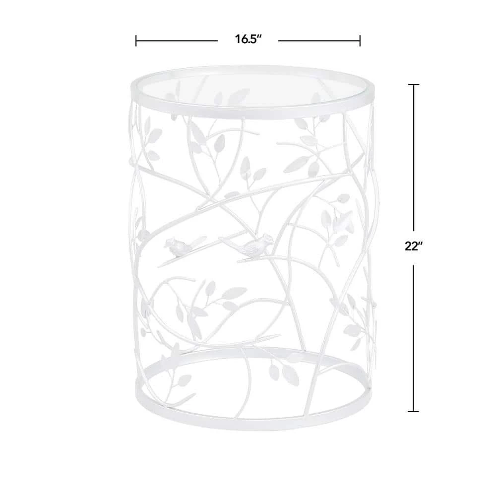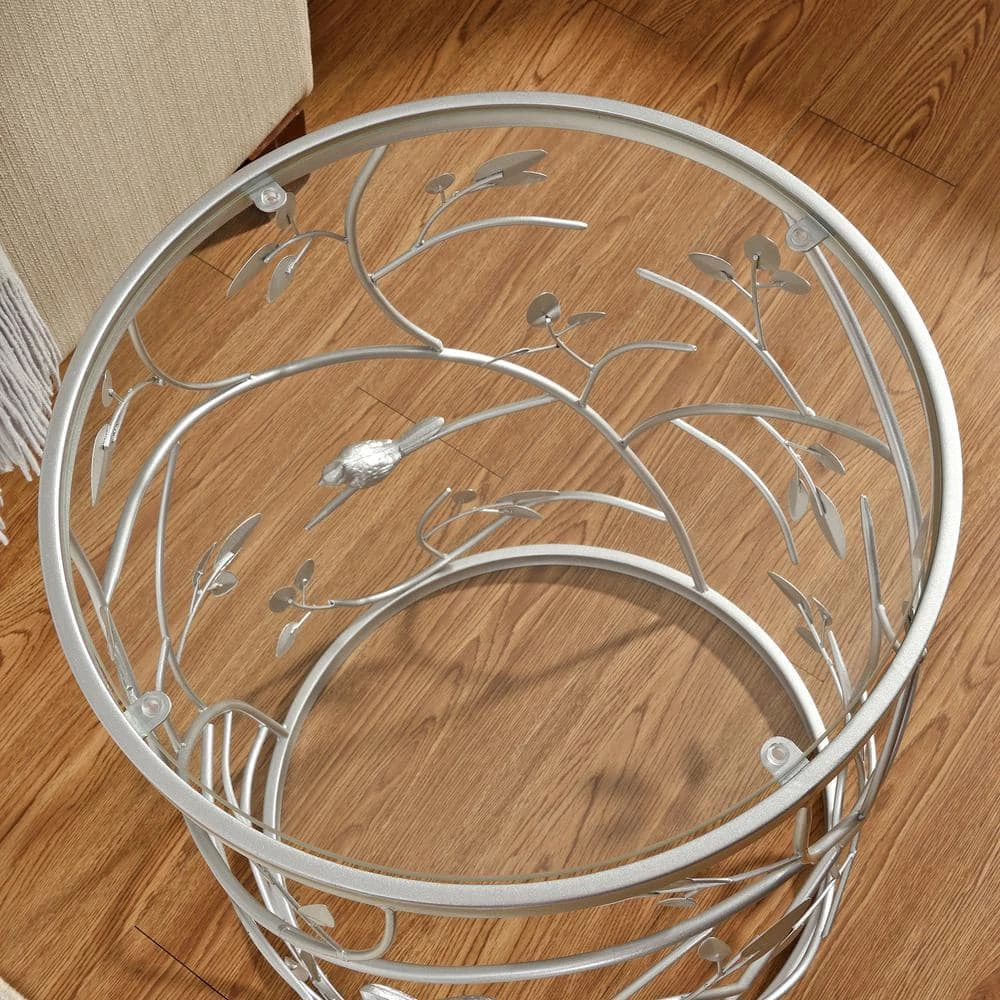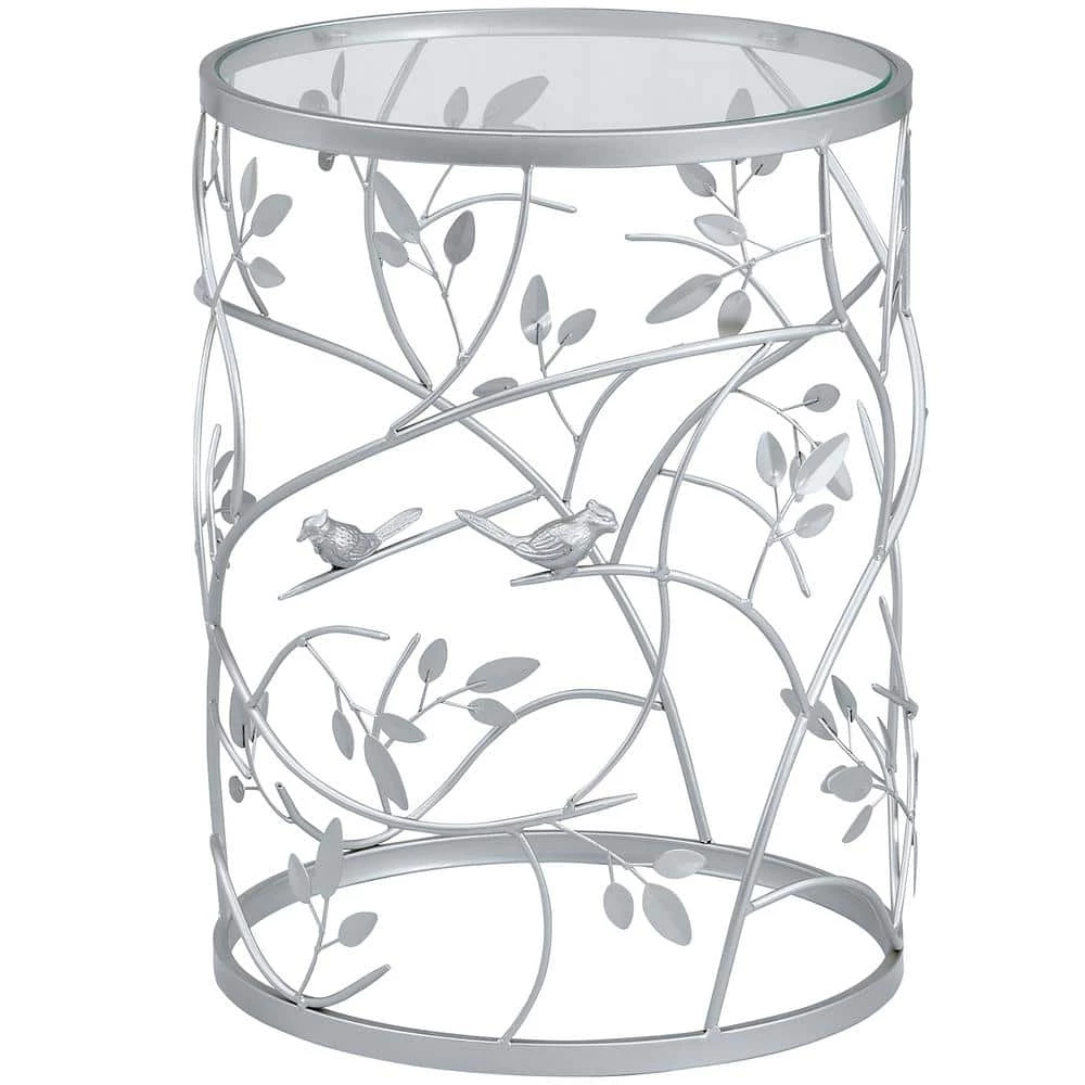 - It’s in the details – this accent table is crafted of iron with an antique silver finish, complete with a carved bird and branches pattern to give it a rustic, yet modern appeal