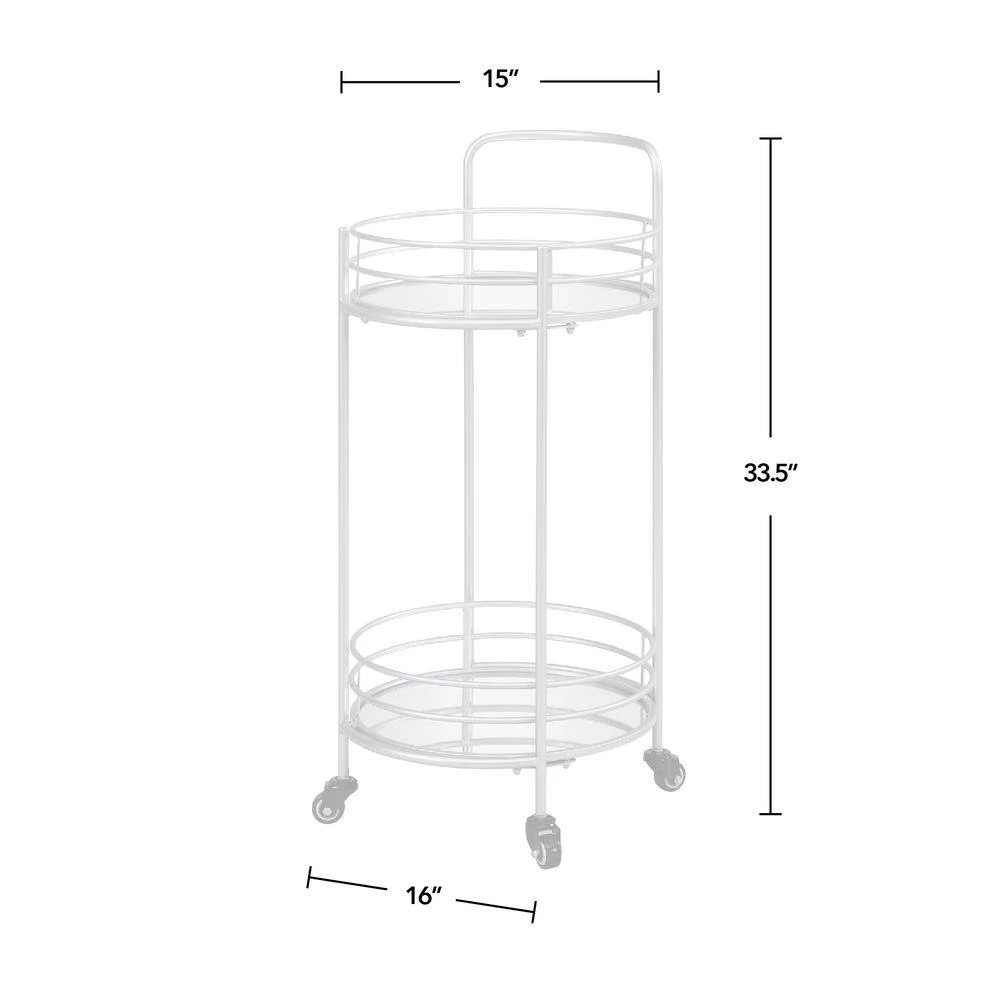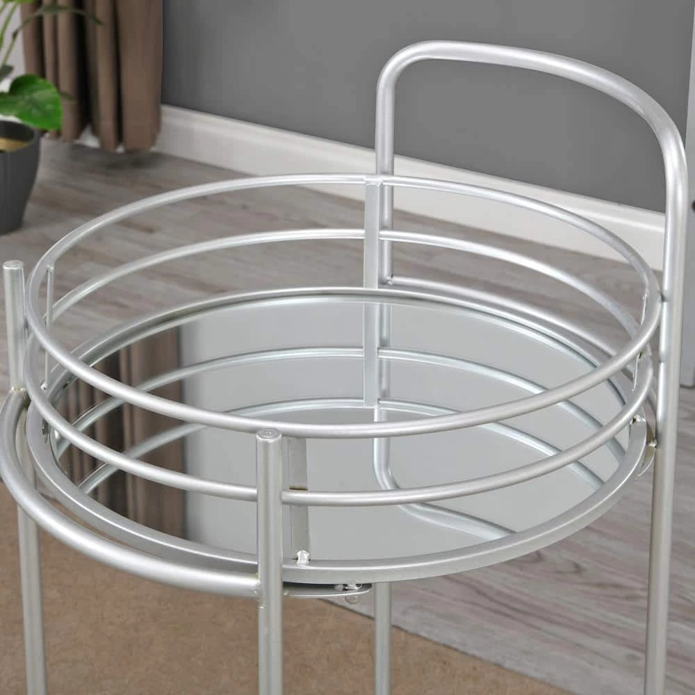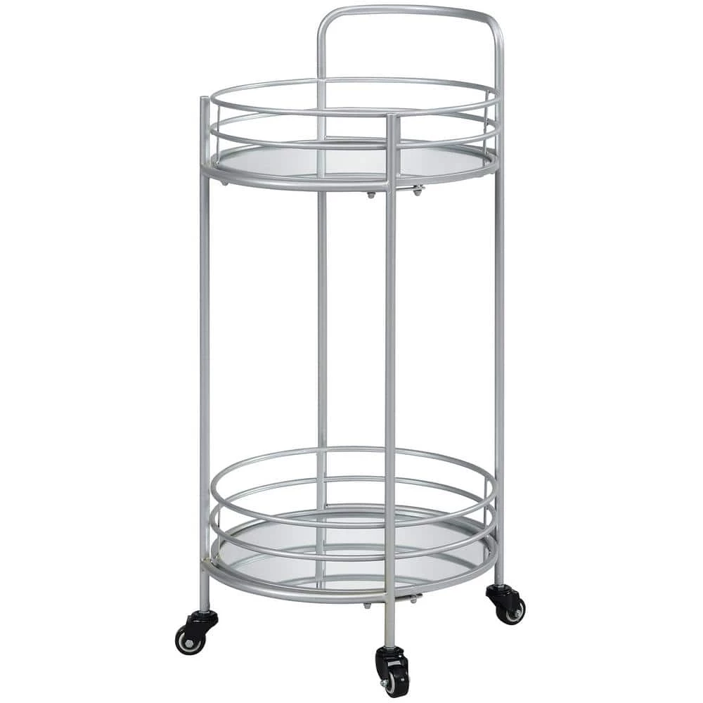 - IT’S IN THE DETAILS – This silver bar cart is a versatile piece with a contemporary silver metal frame and 2 glass mirror shelves. The open circular design allows you to set drinks and snacks on each level, and comes with four metal wheels for easy manuvering.