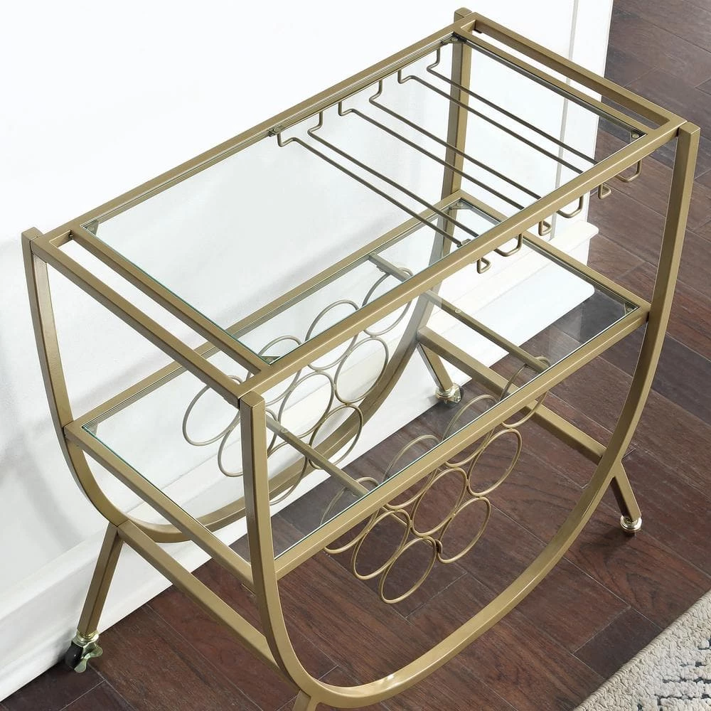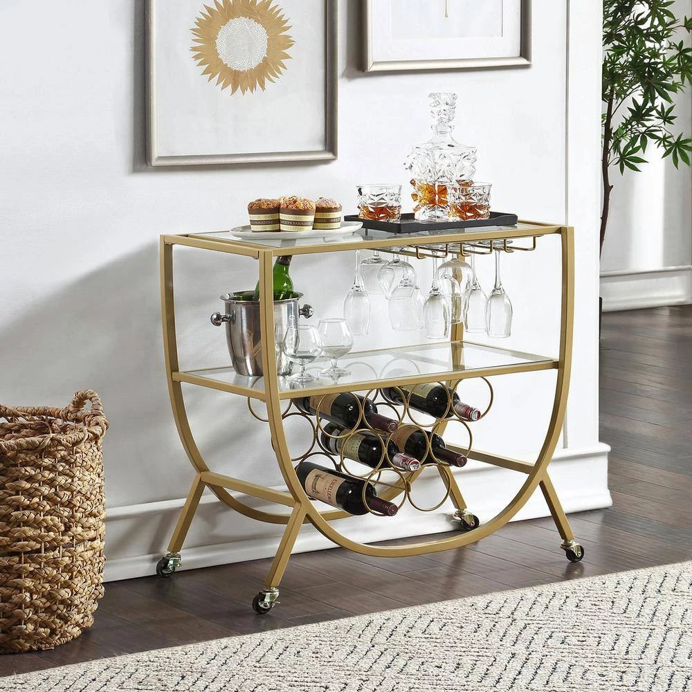 - Fashionable and functional – this beautiful bar cart features 9-wine bottle holders, 3-wine glass racks, and a shelf for storage. with 2-locking wheels for easy maneuvering and an arched design, this bar cart will make a statement in your kitchen, living room or dining room