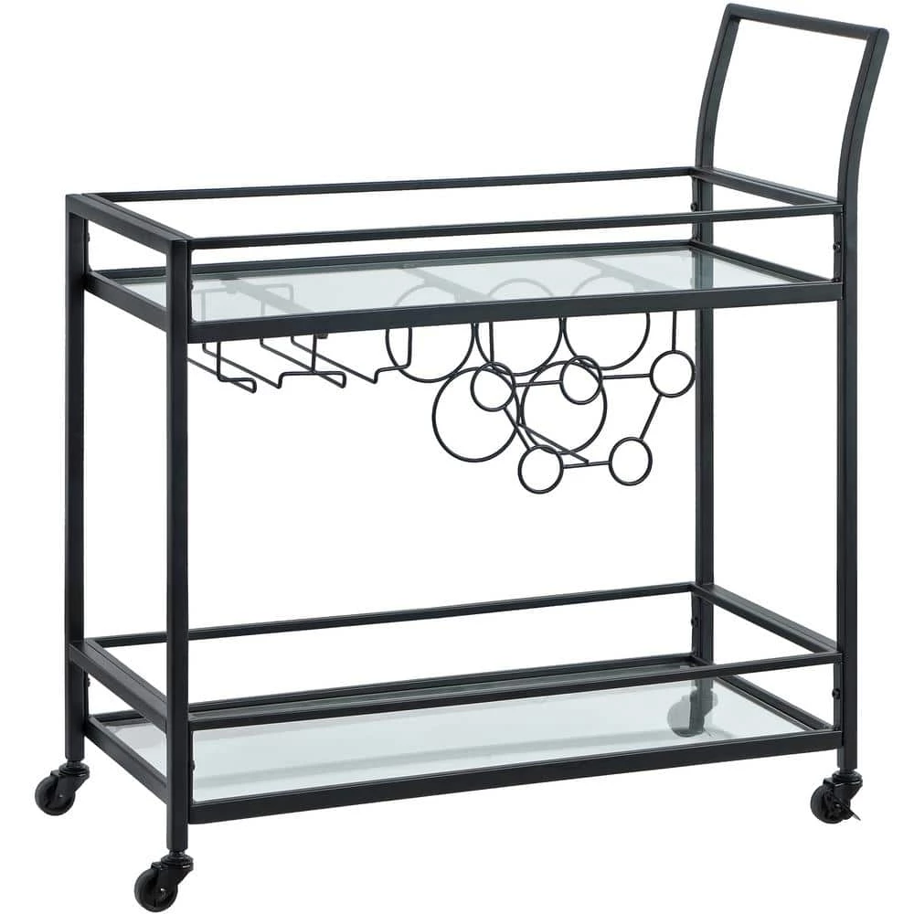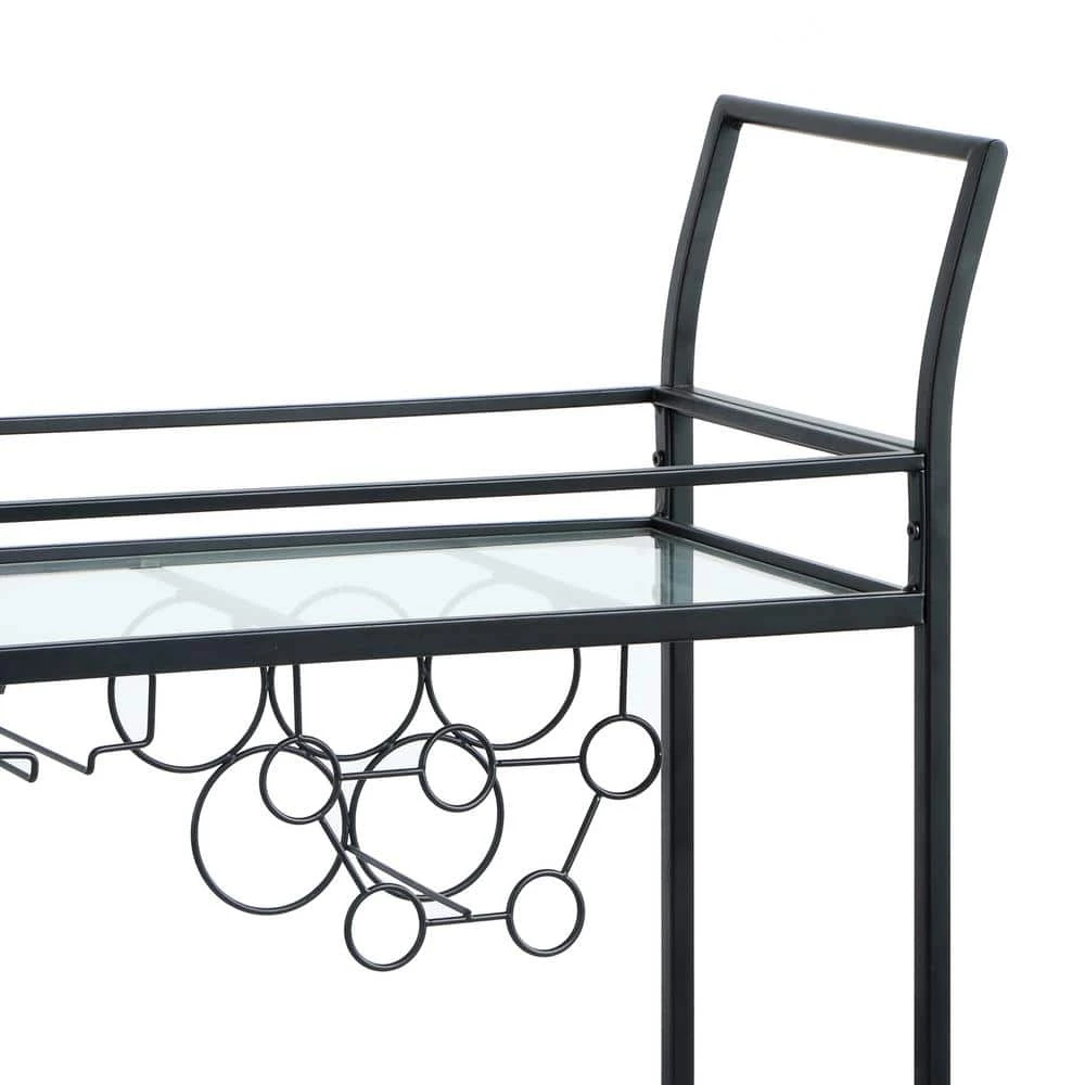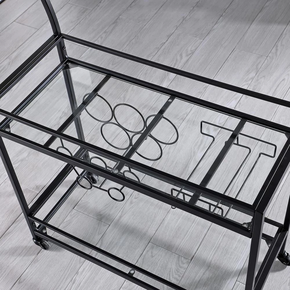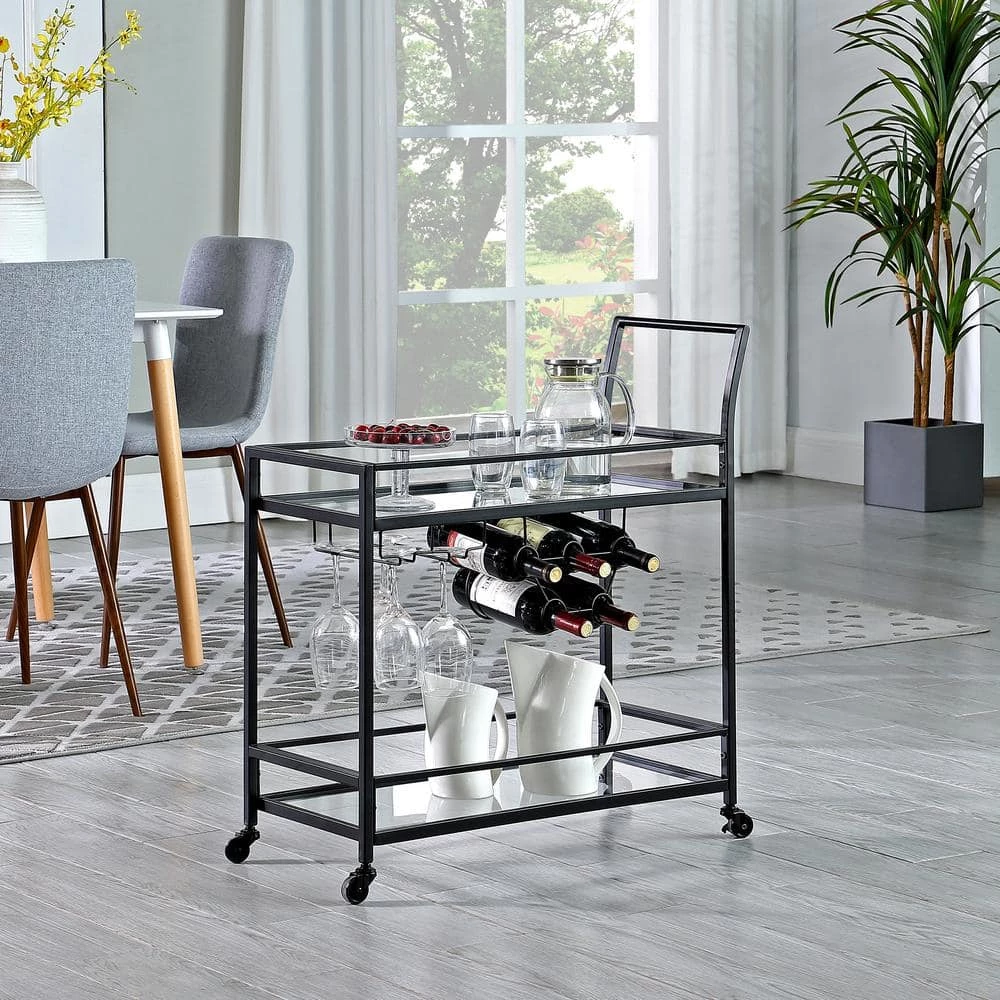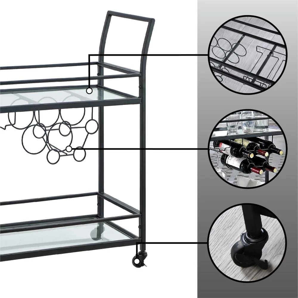 - It’s in the details – this black bar cart is a versatile piece with a metal frame and clear glass shelves, with racks on the second tier that can hold up to 6-wine glasses and 5-compartments for wine bottle storage, the top is open to allow you to set drinks and snacks on top, and it comes with 4-metal wheels for easy maneuvering