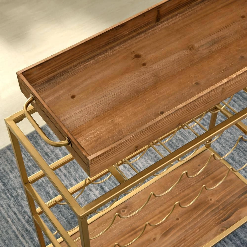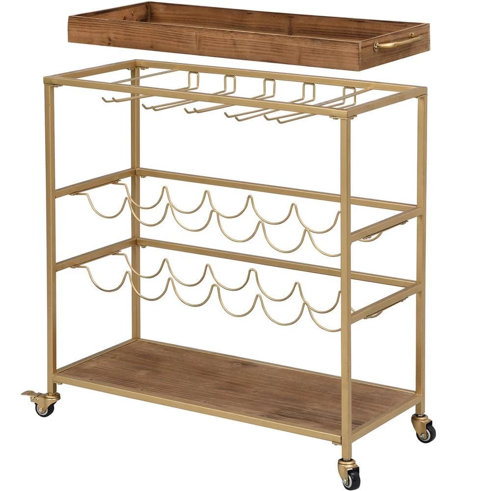 - It’s in the details – this rectangular bar cart is a versatile piece with a flat gold metal frame and rustic brown wood shelf and tray top, it features racks that can hold up to 15-wine glasses, 12-compartments for wine bottle storage, and 4-metal wheels for easy maneuvering, the removable tray top allows you to carry drinks and snacks from the cart to a table with ease