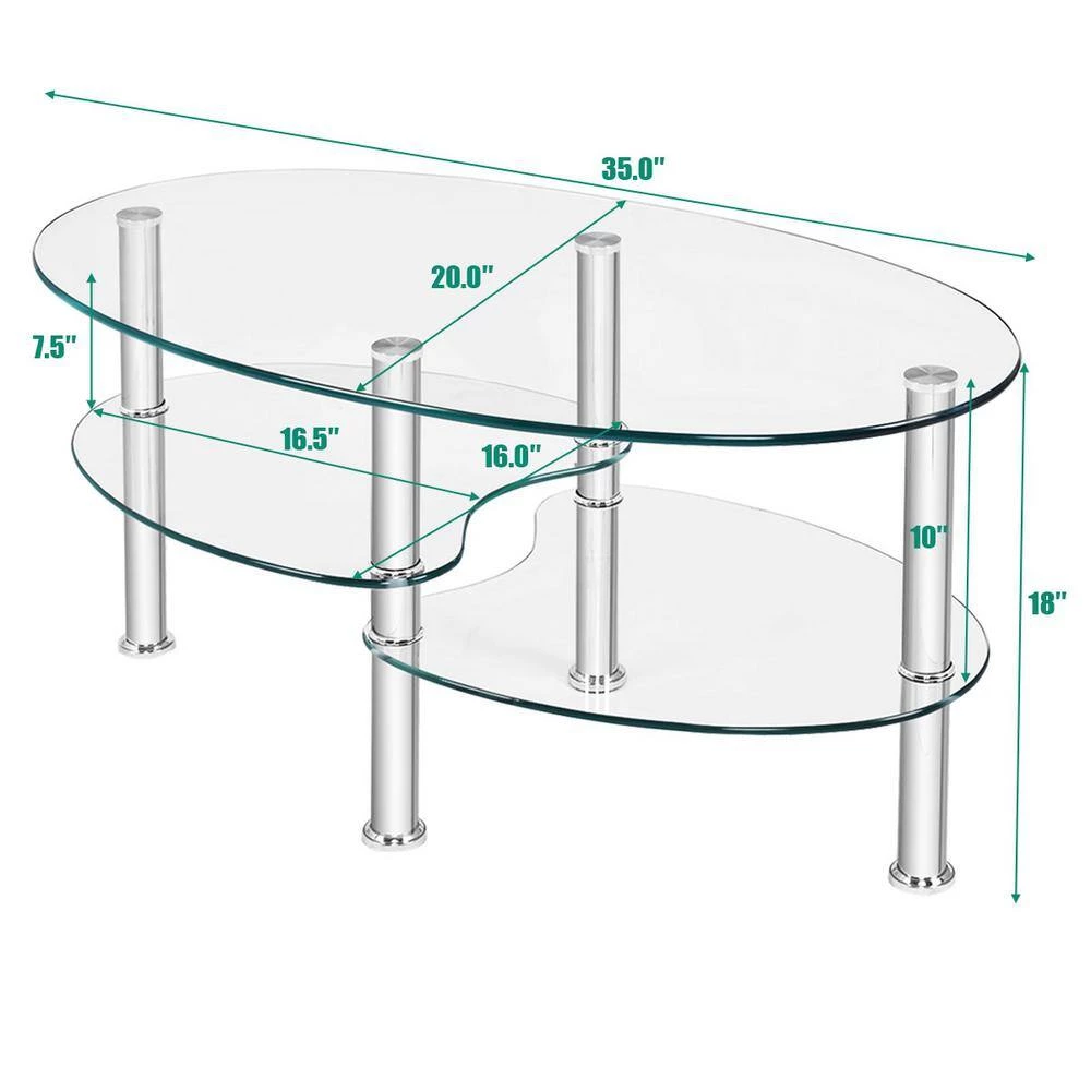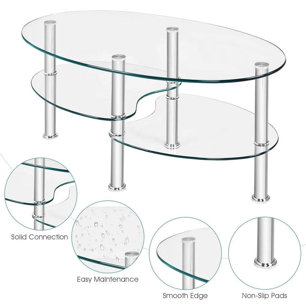 Made of metal and tempered glass. Tempered glass board is safer than normal glass. Metal legs are durable and light, very easy to move. Comes with 2 shelves and irregularly boards, providing you an addtional storage space, you can place tea cups, books, flowers or other decorations in the coffee table, very exqusite. With simple and stylish desgin, the coffee table will be a perfect addtion in your living room.