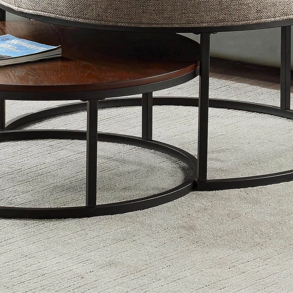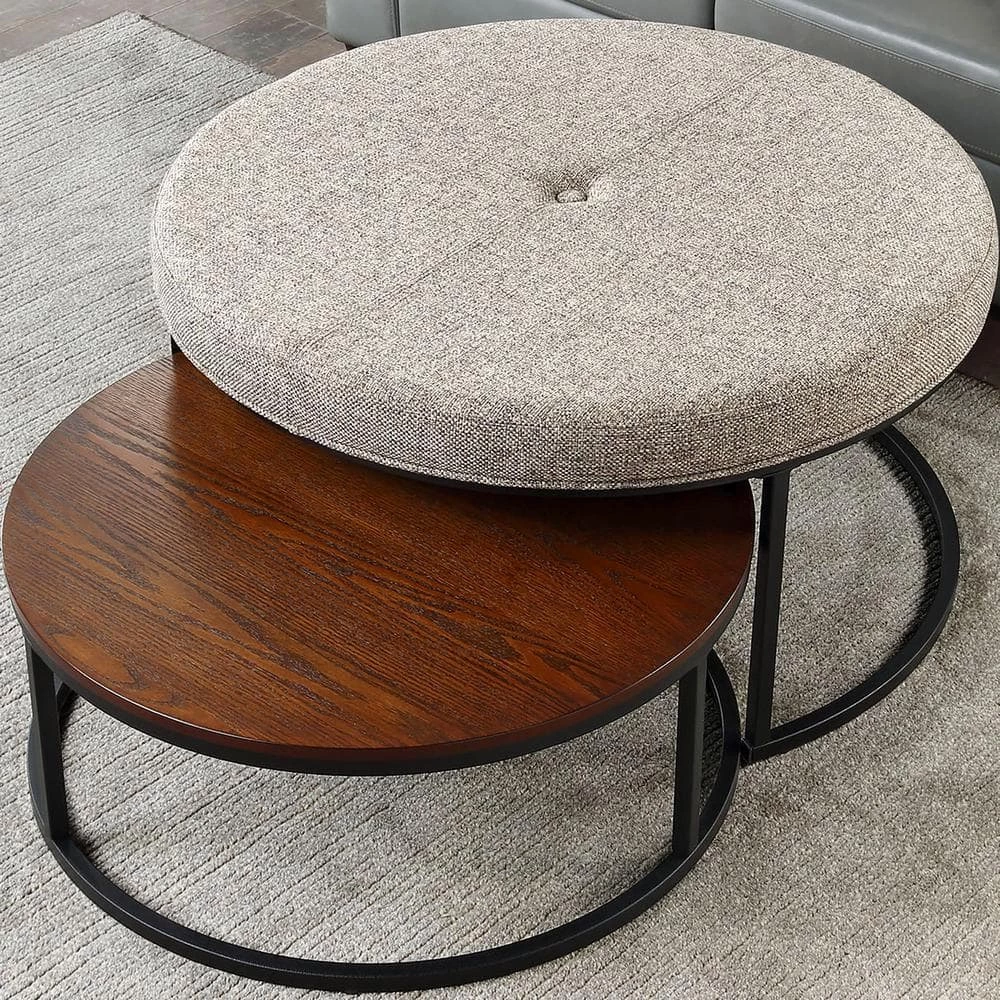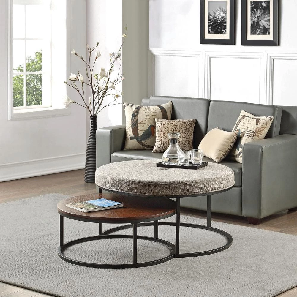 - IT’S IN THE DETAILS – Our round FirsTime & Co. Gray and Kona Corbett Nesting Ottoman and Coffee Table 2-Piece Set is made of wood with a brown finish and is upholstered with gray linen fabric