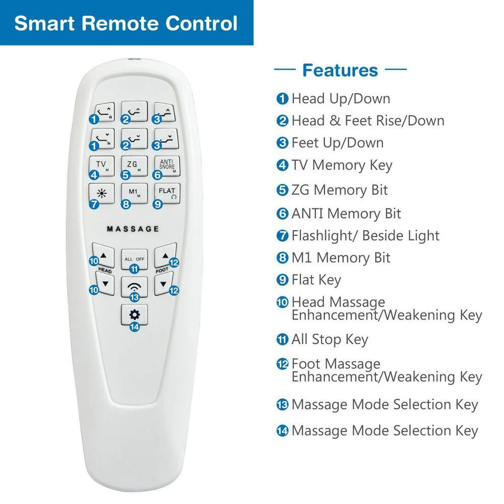 - There are preset positions for your reference, such as zero gravity position, memory position, TV position, anti-snoring position, etc.