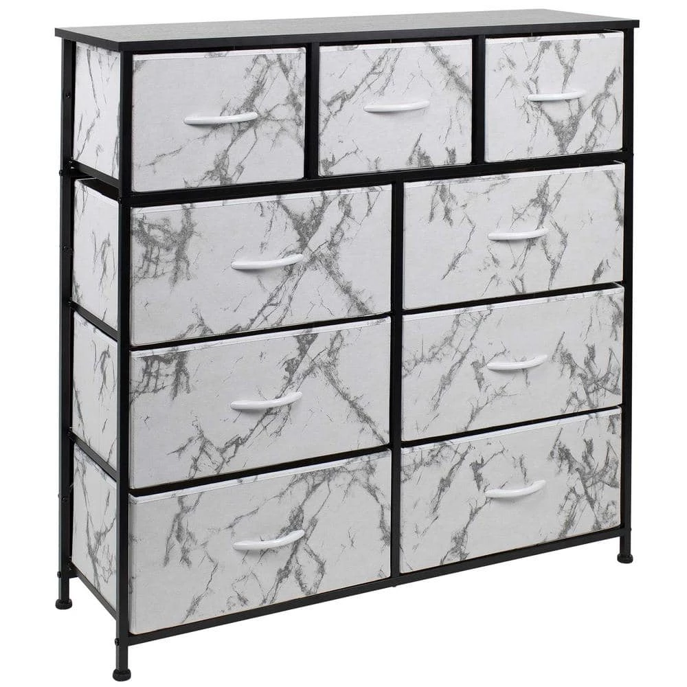 39.5 in. L x 11.5 in. W x 39.5 in. H 9-Drawer Marble White Dresser with Metal Frame Wood Top Easy Pull Fabric Bins by Sorbus