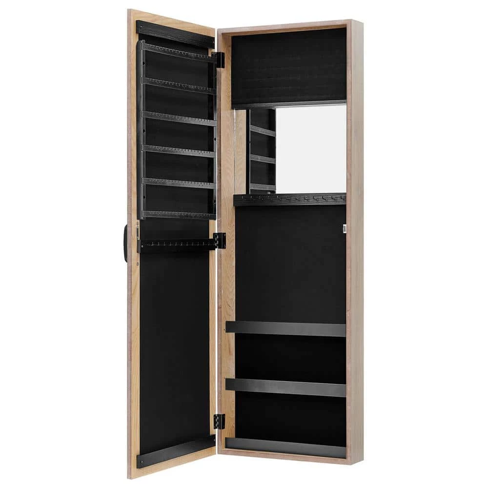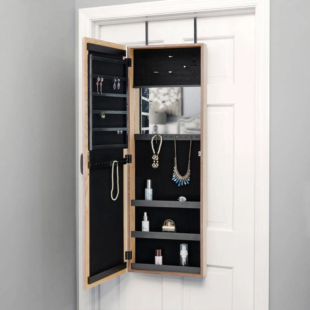 - IT’S IN THE DETAILS – This rectangular jewelry armoire is crafted of wood with a light brown finish, complete with hang-over-the-door hooks for easy installation. It has plenty of space for your jewelry and holds 105 rings, 60 pairs of earrings, and contains 24 hooks for necklaces and bracelets.
