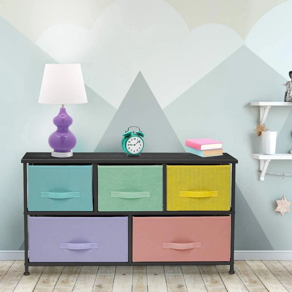 Update your child’s room with the Sorbus 5-drawer Dresser. This colorful dresser chest features a tabletop surface and pull-out-drawers to tuck away household clutter. Place all of your child’s folded t-shirts, jeans, and pajamas, or extra blankets and toys within the spacious fabric drawers. for display, the top surface can be used for lamps, books, clocks, and more. The playful pastel color combo makes this furniture storage charming for any nursery, playroom, or bedroom. It is lightweight for easy transport and when not in use, simply fold the fabric-drawers flat for storage. Complete the look with any unit from our Furniture Collection.