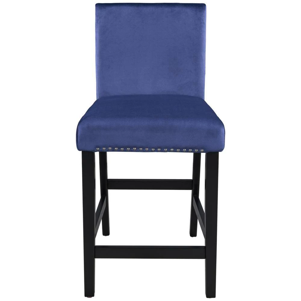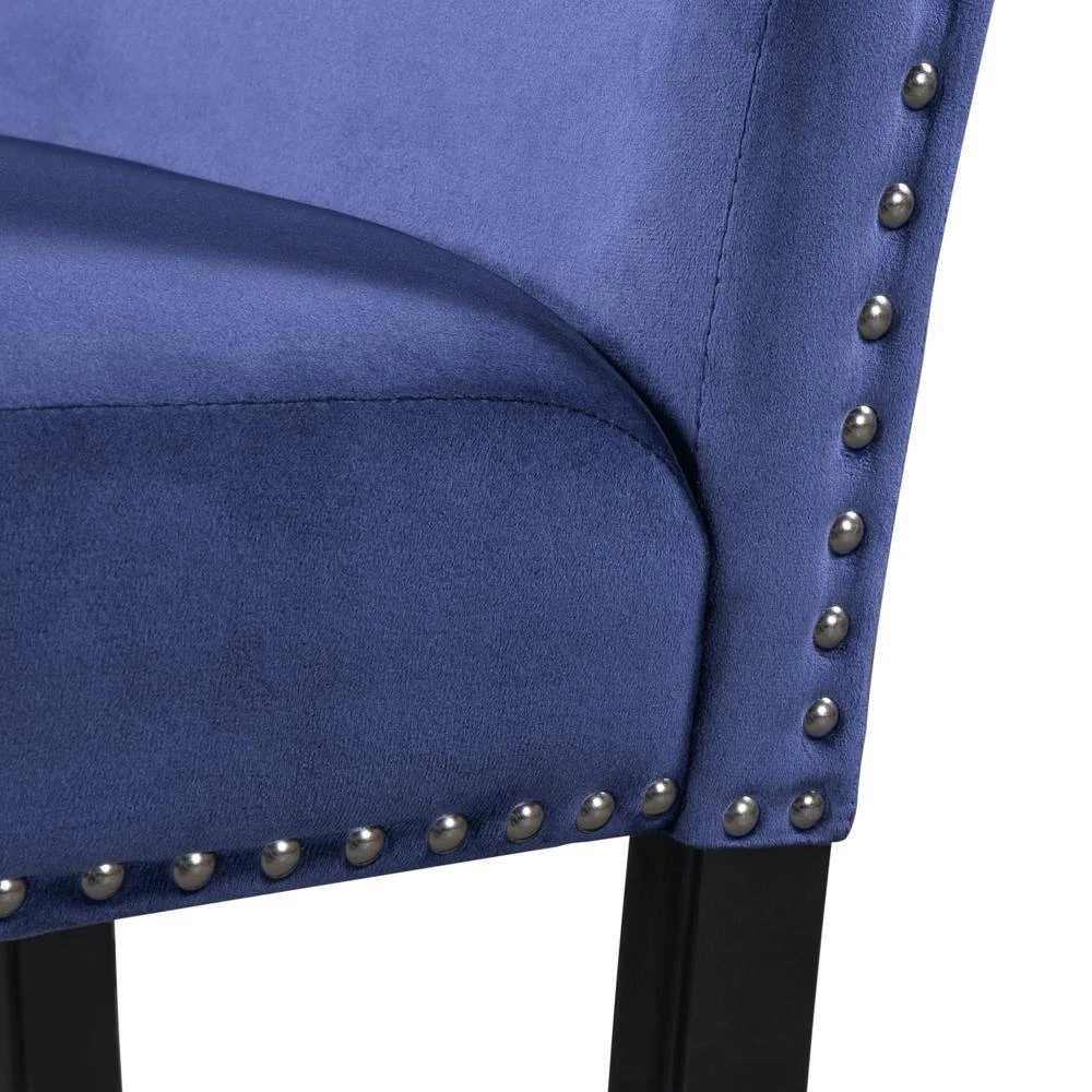 The marble-inspired tabletop adopts organic artificial marble pattern. With 4 blue fabric upholstered chairs and classic silver nail head decoration, it is easy to match any restaurant or kitchen space. In all stages of the production process, the quality is the core of professional manufacturing. The desktop is reinforced with solid MDF, and the top is covered with a thick scratch-resistant shiny marble pattern veneer.
