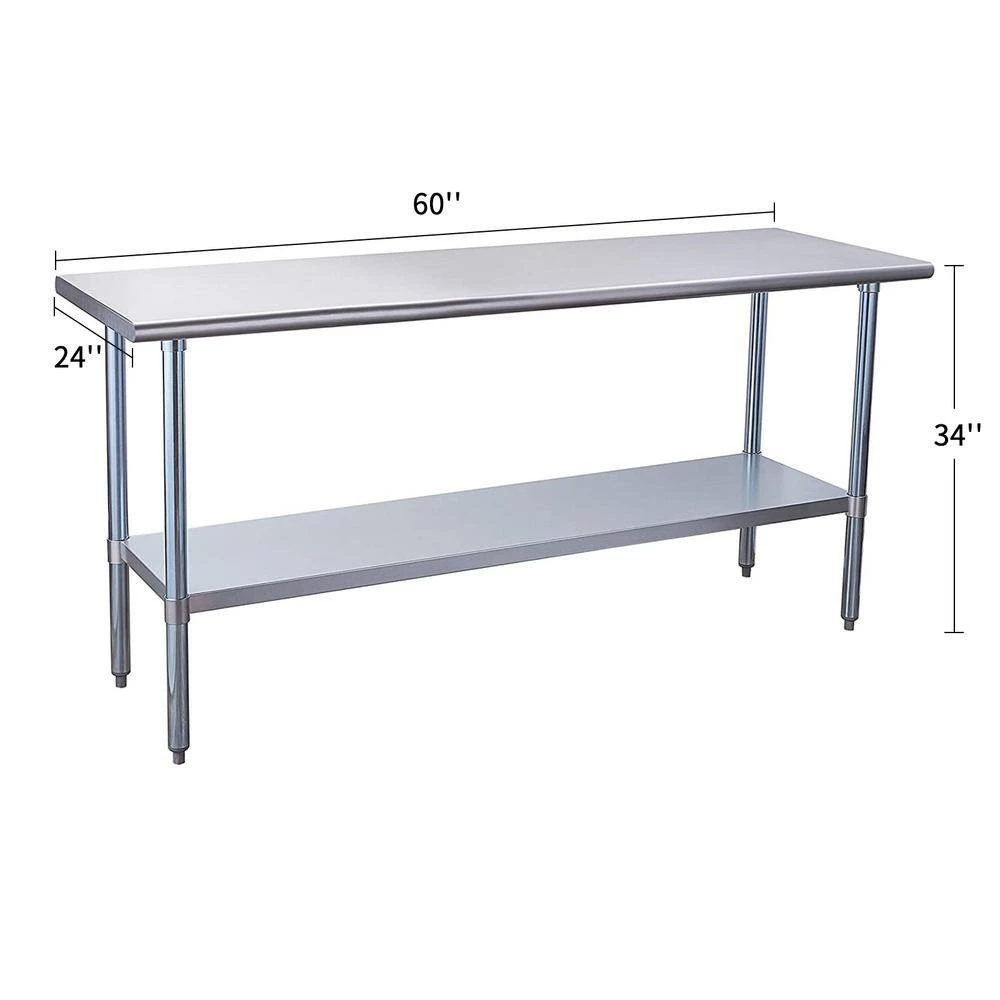 This stainless steel table features a stainless steel construction in a silver finish. This prep table has a height adjustable bottom shelf and backsplash. It is suitable for kitchen, garage, workshop, bar, restaurant, laundry, school, hospital or warehouse.