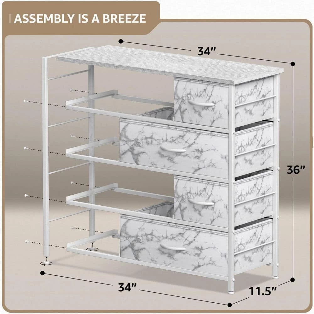 - Smart and stylish design – made with strong steel frame and durable MDF wood top with smooth finish –drawers made of breathable, non-woven fabric – wipe clean – minimal assembly required – hardware and instructions included – measures approximately 34 in. L x 11.5 in. W x 36 in. H