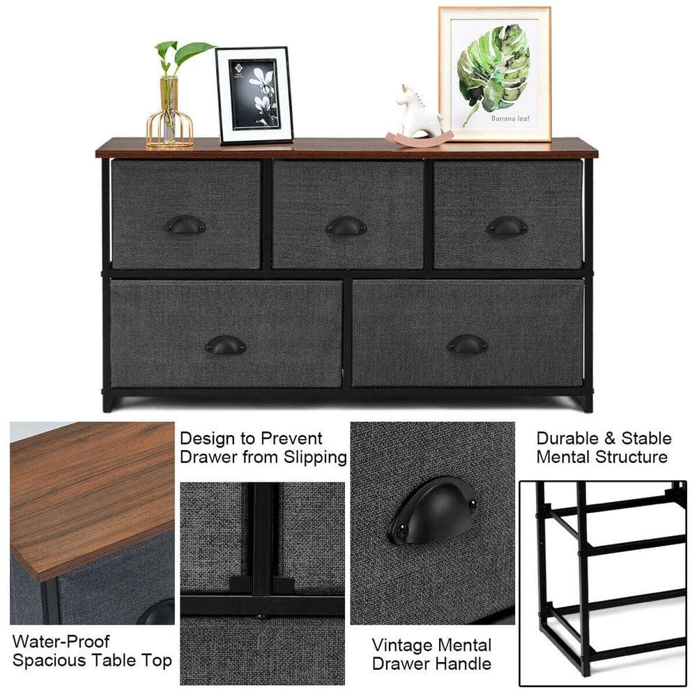 This chest comes with 2 large drawers and 3 medium drawers, which are removable and foldable, provide plenty of storage space for you. The bottom and front panels of our drawers are MDF boards that improve the overall weight capacity up to 5.5 lbs. The construction is made of solid metal frame and comes with a power-coated surface, which is firm, stable and rust-resist for long term use. The top also made of MDF, which is non-deformable and wear–resistant. The chest can be placed in apartments, condos, and dorm rooms. The simple and elegant style make it easily match any room and any furniture.