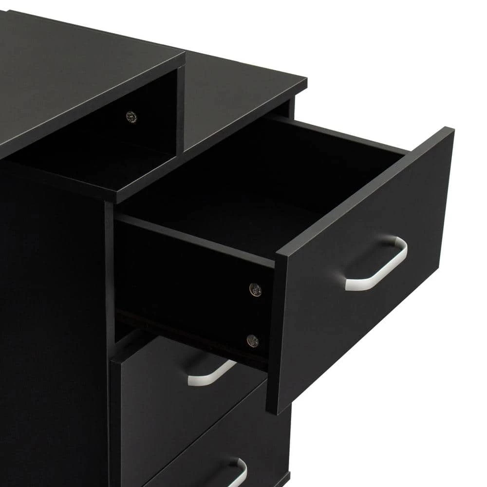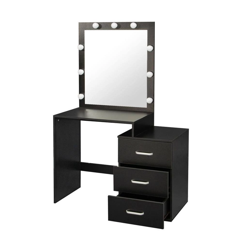 This bedroom vanity table with a timeless black color gives a feeling of calmness and sophistication. Jewelry, makeup tools and other objects can be storaged in the drawers. Featuring a rectangular mirror with LED light bulbs, it is easy to make up perfectly by looking at it.