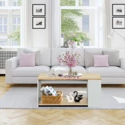 35 in. Natural Rectangle Wood Coffee Table Sofa Side Table with Storage Shelves by ANGELES HOME