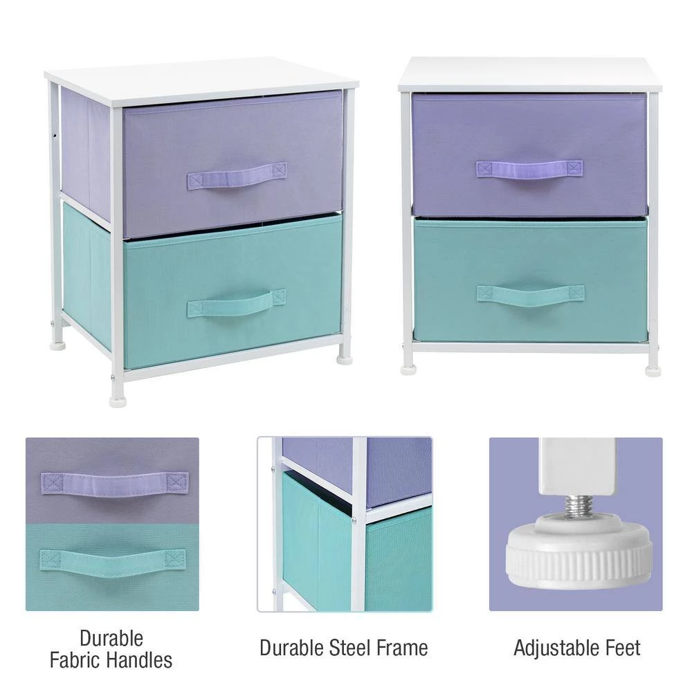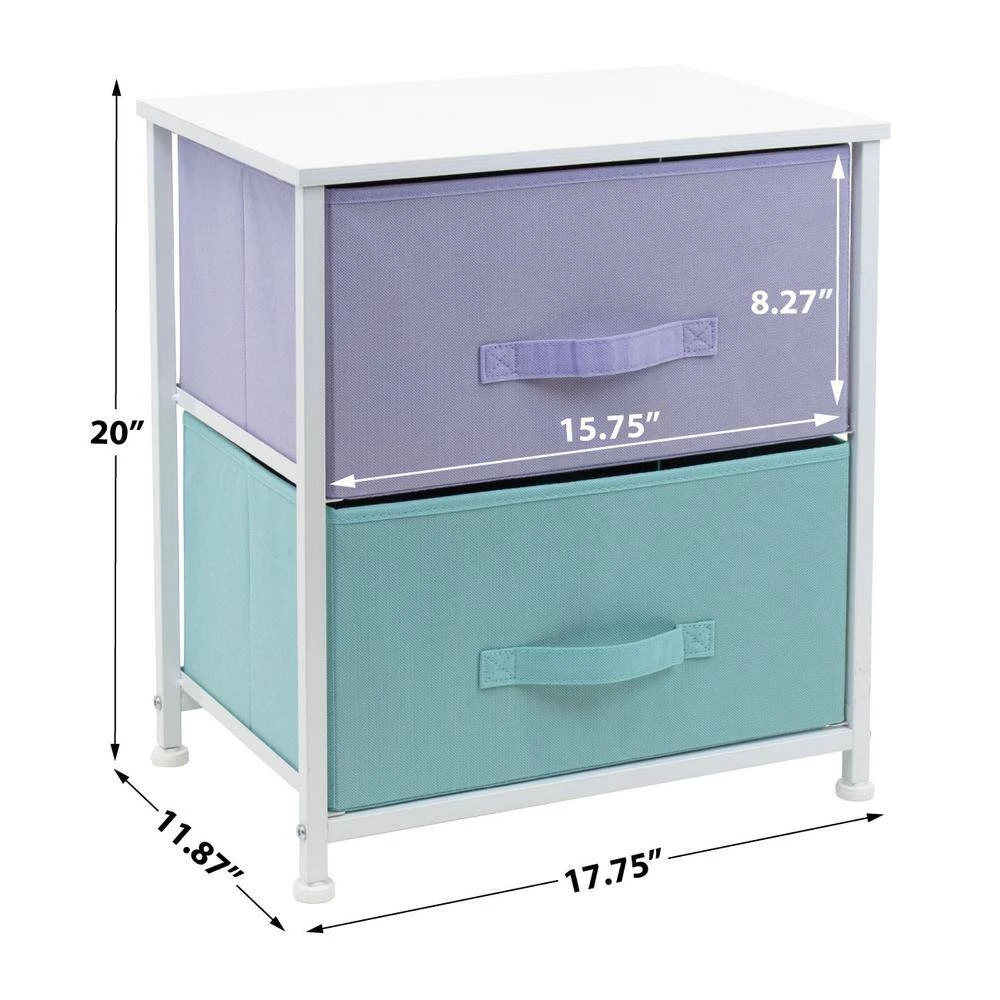 Update your child’s room with the Sorbus 2-Drawer Nightstand. This charming piece features a tabletop surface and pull-out drawers to tuck away household clutter. Place all of your child’s folded t-shirts, jeans, and pajamas, or extra blankets and toys within the spacious fabric drawers. For display, the top surface can be used for lamps, books, clocks, and more. The playful pastel color makes this furniture storage ideal for any nursery, playroom, or bedroom. It is lightweight for easy transport and when not in use, simply fold the fabric drawers flat for storage. Complete the look with any drawer configuration from the Sorbus Furniture Collection. Great addition to any room. Bring on the toys, books, and blankets! Display this charming nightstand in the kid’s bedroom filled with linens and clothes or play area complete with coloring books, Legos, plushies, and dolls! The soft lightweight fabric makes it easy for kids to pull out their favorite toys for play dates or easily put them away within the colorful drawers. With kids and teens in mind, it complements pastel rainbow decor, unicorn themes, and trendy ombre colors for a fun look. Trendy design with easy assembly. 2-drawer nightstand (Tie-dye). Hardware and instructions INCLUDED. Drawers made of non-woven (polyester) fabric. Frame made of steel and MDF wood with white finish. Accessories shown in image NOT INCLUDED. Measures approximately 17.75″ L x 11.87″ W x 20″ H.
