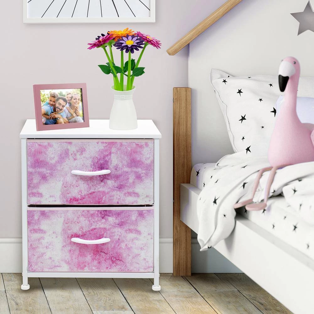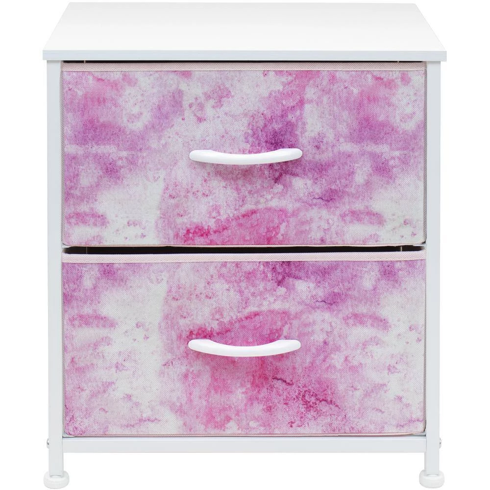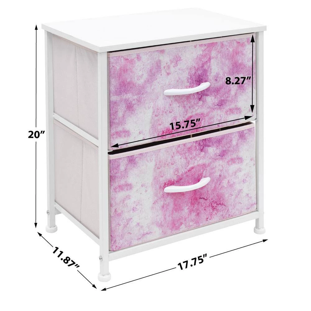 Update your child’s room with the Sorbus 2 Drawer Nightstand. This charming piece features a tabletop surface and pull out drawers to tuck away household clutter. Place all of your child’s folded t shirts, jeans, and pajamas, or extra blankets and toys within the spacious fabric drawers. For display, the top surface can be used for lamps, books, clocks, and more. The playful pastel color makes this furniture storage ideal for any nursery, playroom, or bedroom. It is lightweight for easy transport and when not in use, simply fold the fabric drawers flat for storage. Complete the look with any drawer configuration from the Sorbus Furniture Collection. Great addition to any room. Bring on the toys, books, and blankets. Display this charming nightstand in the kid’s bedroom filled with linens and clothes or play area complete with coloring books, Legos, plushies, and dolls. The soft lightweight fabric makes it easy for kids to pull out their favorite toys for play dates or easily put them away within the colorful drawers. With kids and teens in mind, it complements pastel rainbow decor, unicorn themes, and trendy ombre colors for a fun look. Trendy design with easy assembly. 2 drawer nightstand (Tie dye). Hardware and instructions INCLUDED. Drawers made of non woven (polyester) fabric. Frame made of steel and MDF wood with white finish. Accessories shown in image NOT INCLUDED. Measures approximately 17.75 in. L x 11.87 in. W x 20 in. H.