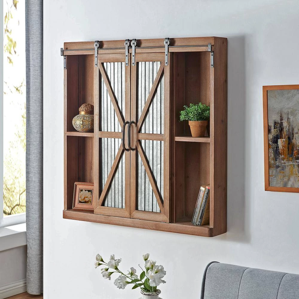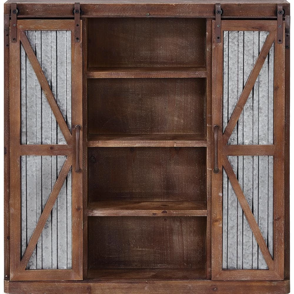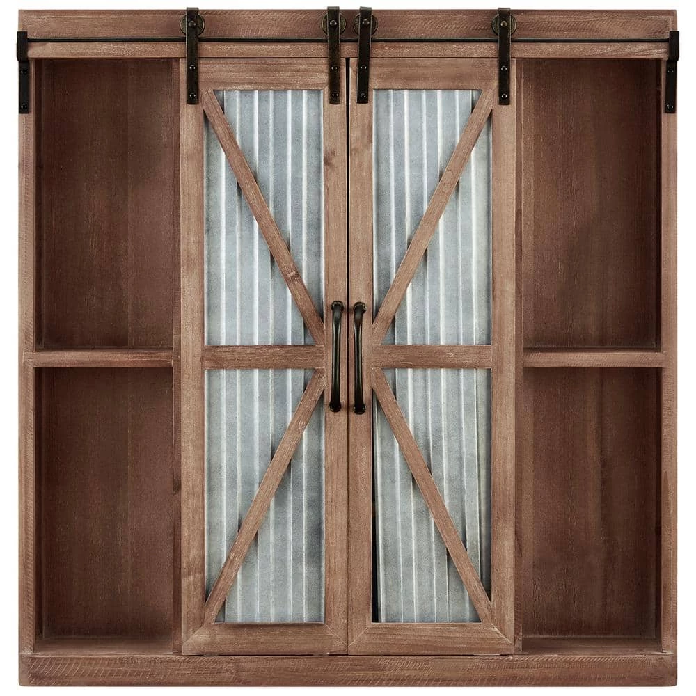 - It’s in the details this barn door cabinet is crafted of solid wood with a weathered brown finish, complete with fully functional galvanized metal doors that slide back and forth