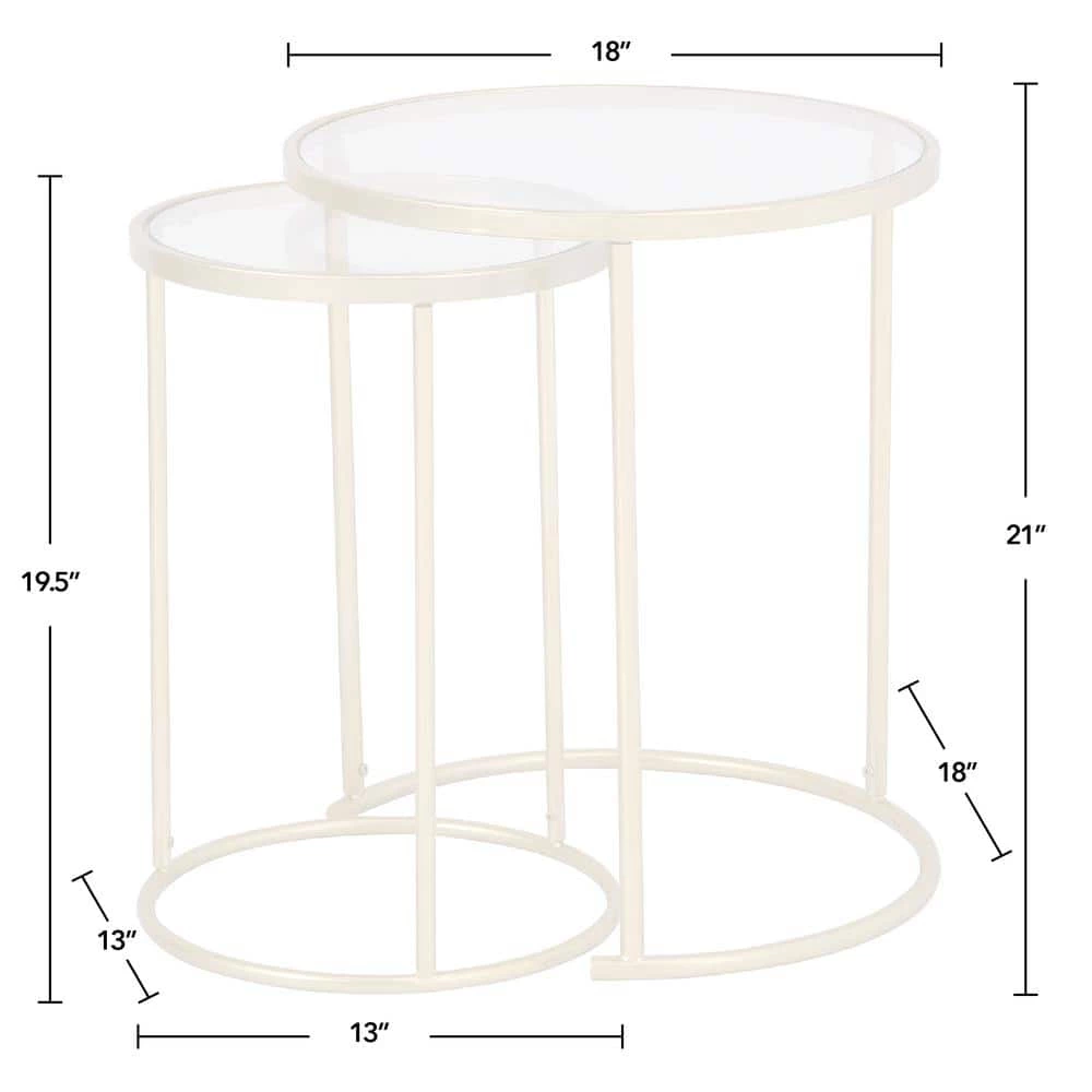 - Size matters – our firstime and co. stark gold nesting end table 2-piece set has a larger table with a 21 in. H, 18 in. W and 18 in. D, and a smaller table with a 19.5 in. H, 13 in. W and 13 in. D.