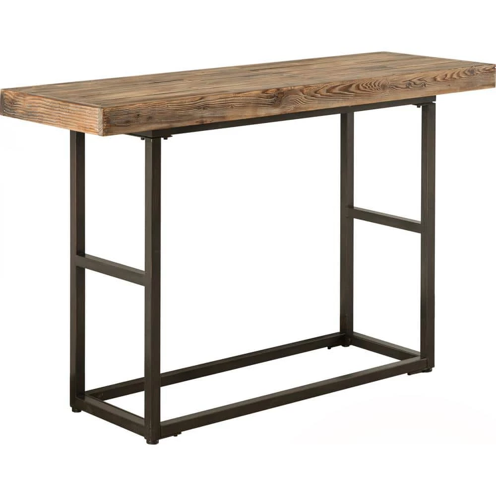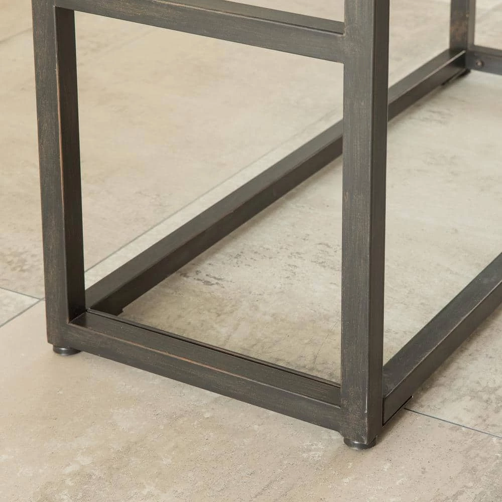 - IT’S IN THE DETAILS – This rectangular console table is crafted of wood and metal, featuring a black frame with a rustic brown top.